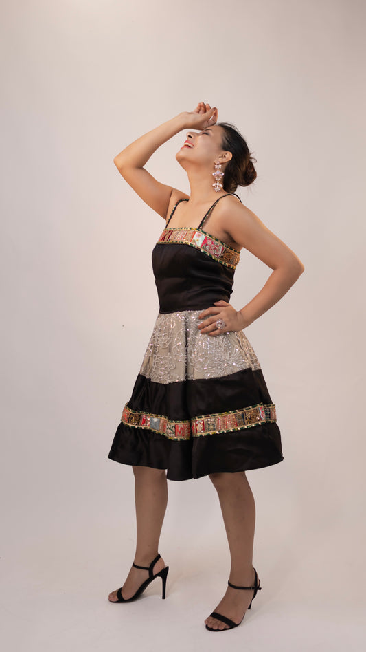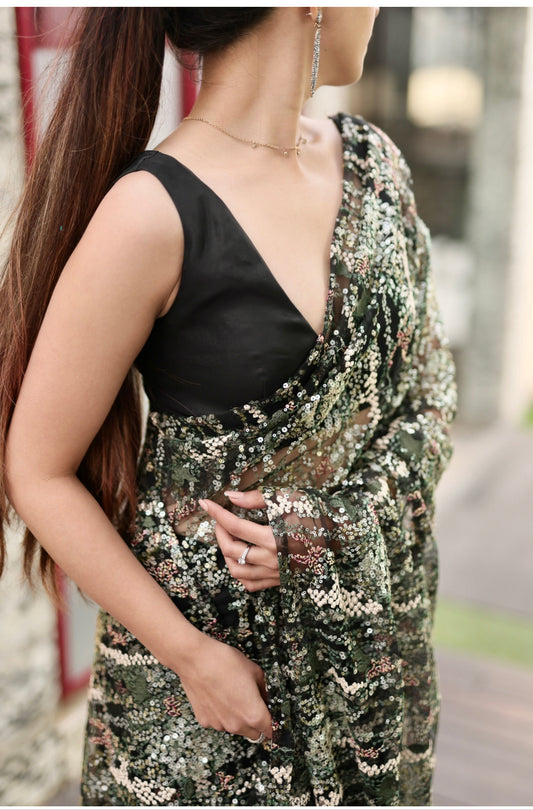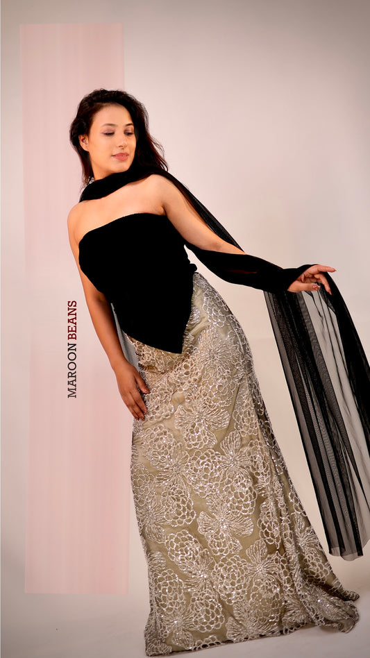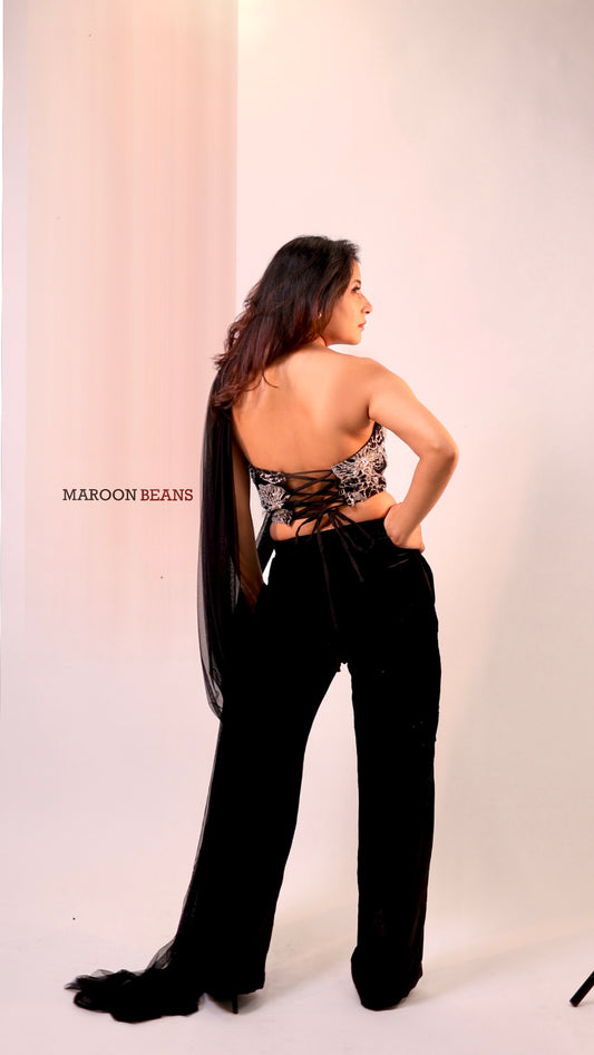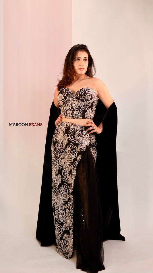 Black Velvet Geometric Blouse With Lehenga Skirt