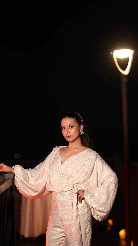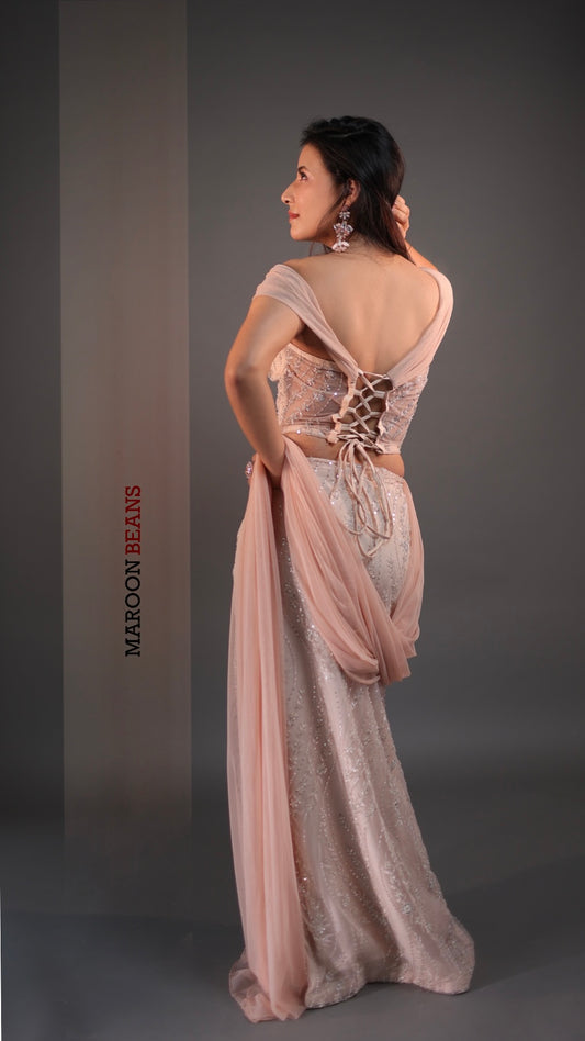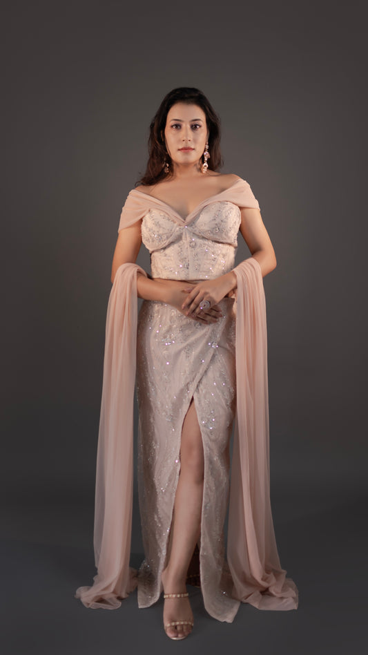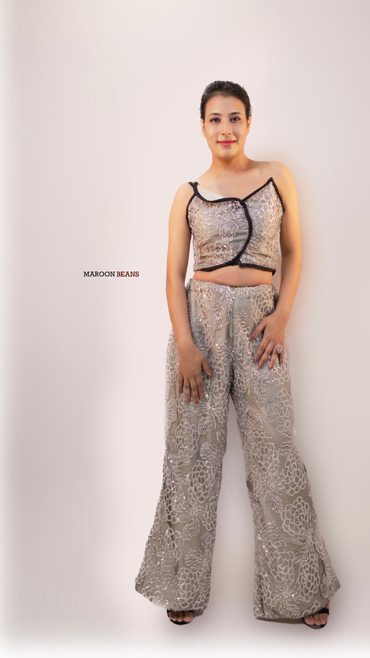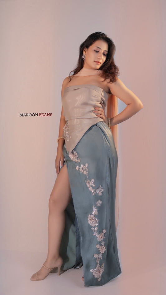 Dusty Blue AppliquƩ Skirt with Asymmetrical Blouse