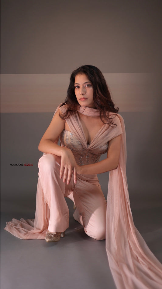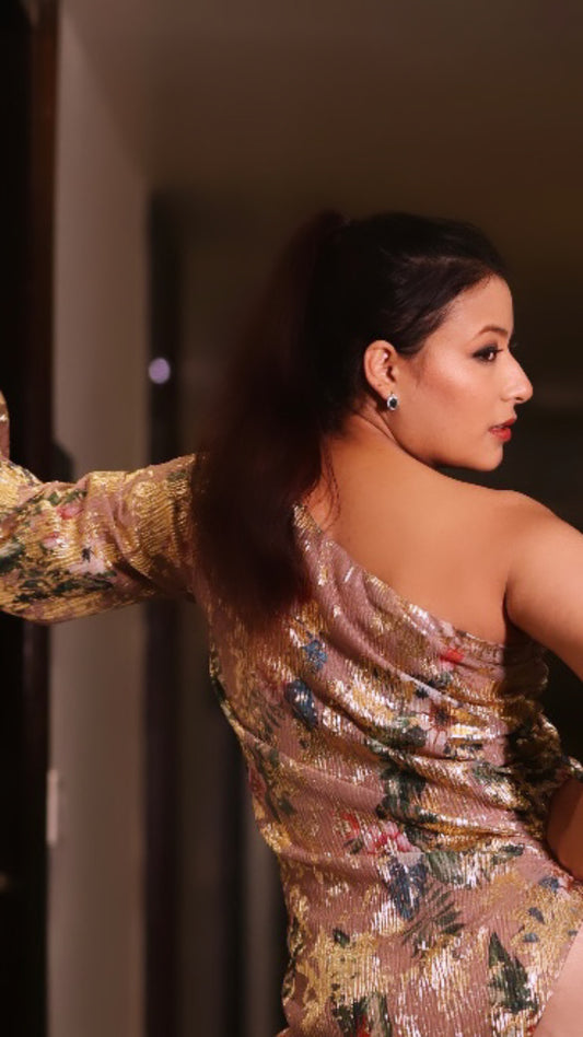 Asymmetrical Velvet Blouse with Gold Lehenga