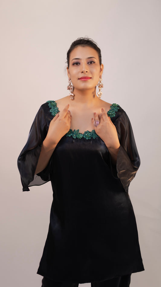 Dusty Blue Appliqué Skirt with Asymmetrical Blouse